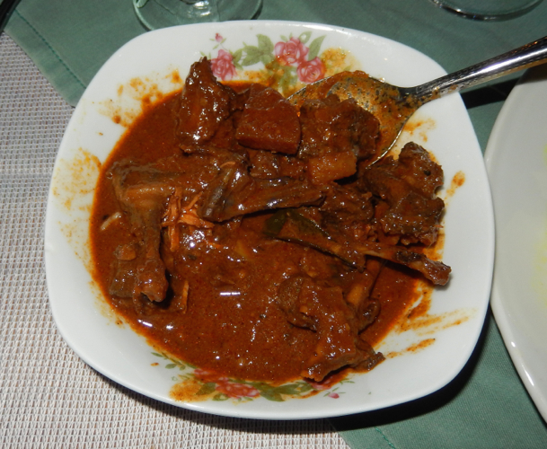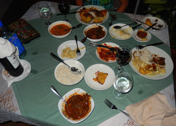 The culture of the Seychelles is Creole. Creole is the domestic language while English is used in business. We wanted to taste the Creole food so we visited Marie Antoinette’s Creole Restaurant. We heard from our guides that a specialty of the island was fruit bat curry. We had to go when we found out that Marie Antoinette’s was serving it only one night this week. A fruit bat is about the size of a small rabbit with the face of a dog and wingspan of about three feet. They set up nets at night and trap them as they fly. This species of bat is related to the dog and not the normal bat. It has the face of a dog and looks like a flying chihuahua. My philosophy is the cuter they are the tastier they are – and yes Janine ate it too. Marie Antoinette’s menus was pre fixe. Nothing to order. You sat down and they began bringing food. One of everything from the Creole cuisine. It was wonderful. A bottle of good red wine and fruit bat, it doesn’t get any better than that.