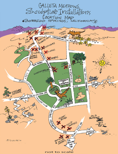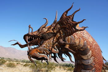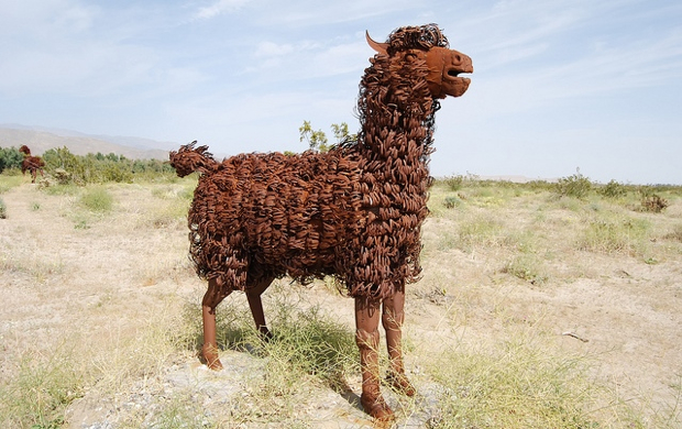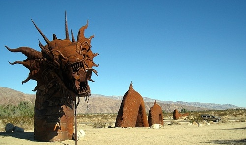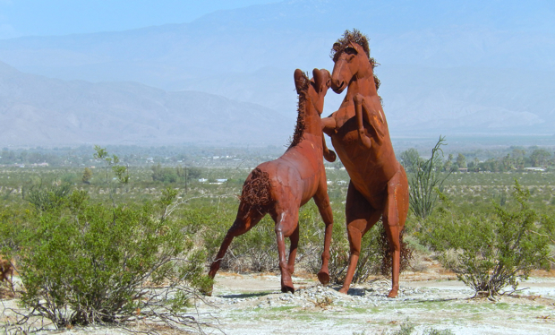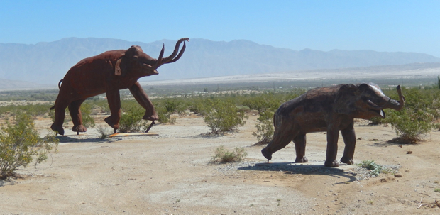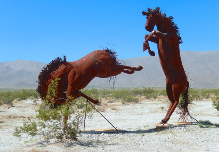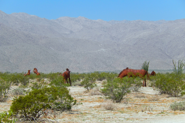 Elephants, a herd of wild stallions, dragons, sloths, and a huge eagle sitting in the middle of the desert? If you think that’s nuts, then you are in Borrego Springs, CA. Galleta Meadows is a sculpture environment replicating the creatures that lived in the area 3 million years ago. Dennis Avery, land owner of Galleta Meadows Estates in Borrego Springs envisioned the idea of adding ‘free standing art’ to his property with original steel welded sculptures created by ‘Perris Jurassic Park’ owner/artist/welder Ricardo Breceda based in Perris, California. There are 129 metal sculptures located in Borrego Springs.