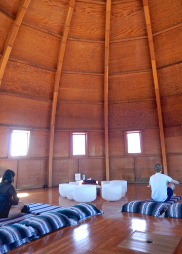 The bowls are created by crushing and heating 99.99% pure quartz to 4000 degrees Fahrenheit and spinning it in a centrifugal mold. The purity of sound from the bowls, coupled with the acoustics of the all-wood paraboloid, is said to have “alternative” healing powers. The building is considered to be the only “all-wood, acoustically perfect sound chamber in the U.S.” and attracts thousands of visitors annually.