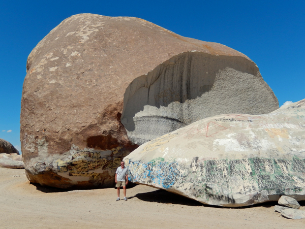 The Giant Rock is a large freestanding boulder in the Mojave Desert near Landers, California, that covers 5,800 square feet of ground and is seven stories high. Giant Rock is purported to be the largest free standing boulder in the world. Native Americans of the Joshua Tree, California, area consider it to be sacred. In the 1950s it was a gathering point for UFO believers. It is located on land which was at that time leased by George Van Tassel, a purported flying-saucer contactee and organizer of UFO conventions. Van Tassel also built the nearby Integratron and a small airport in the vicinity, which he operated from 1947 to 1975. A single large room, which was subsequently filled in, was dug beneath the rock and resided in by a prospector named Frank Critzer during the 1930s and early 1940s. Critzer, a friend of Van Tassel’s, perished in a self-detonated dynamite explosion in this room on July 24, 1942, while being investigated by local police. Shortly after the turn of the 21st century, Giant Rock fractured in two, revealing an interior of white granite. The exterior surface of the rock is partially covered in graffiti. (stolen from the web)