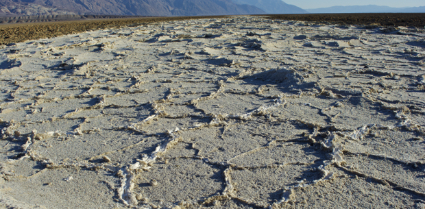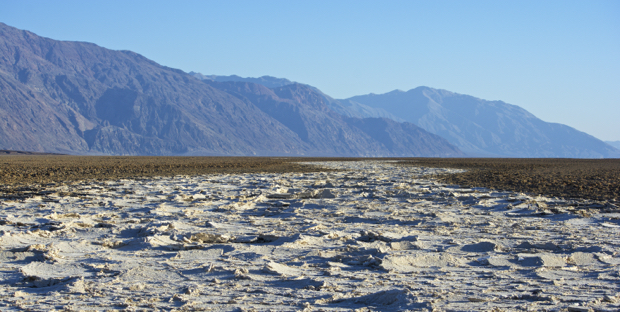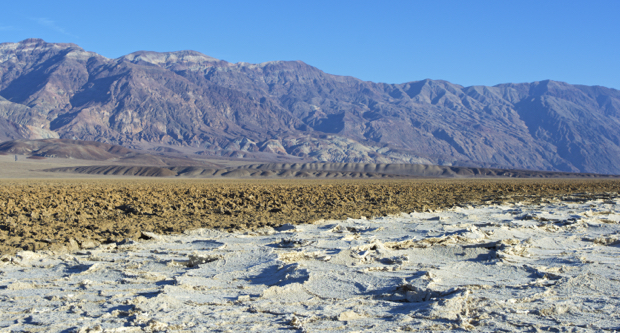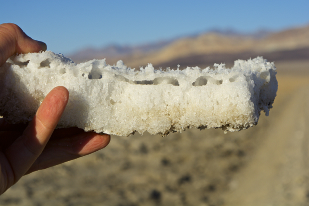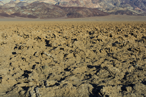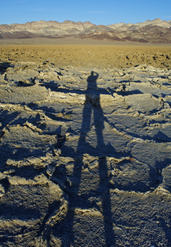 We ventured out on the salt flats so my friend Jim and his wife Diana could do an artistic photo shoot. This is the lowest point of Death Valley and one of the driest places on earth. The moonscape of a broken glass sharp salt crust that appeared benign, but would cut your hand if you weren’t cautious. The crust was as hard as cement and gave a broken pottery sound when cracked. It also produced a high frequency ring when hit as if you were hitting a porcelain vase with a small rubber mallet. The white salt river in the center of the valley was from the last flowing section of water and ofter dried into hexagon formations on the desert floor. The surrounding brown fields are mud covered salt that eventually pushed it’s way upward as it froze, thawed, and dried.