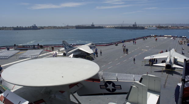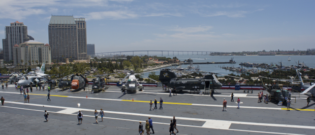 USS Midway was an aircraft carrier of the United States Navy, the lead ship of its class. Commissioned a week after the end of World War II, Midway was the largest ship in the world until 1955, as well as the first U.S. warship too big to transit the Panama Canal. A revolutionary hull design, based on the planned Montana-class battleship, gave it better maneuverability than previous carriers. It operated for an unprecedented 47 years, during which time it saw action in the Vietnam War and served as the Persian Gulf flagship in 1991’s Operation Desert Storm. Decommissioned in 1992, it is now a museum ship at the USS Midway Museum, in San Diego, California, and the only remaining U.S. aircraft carrier of the World War II era that is not an Essex-class aircraft carrier. It is now on display at the San Diego Maritime Museum. (stolen from the web).