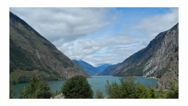 Rode from Pemberton to Quesnel which is really close to Prince George. Tomorrow I make the left turn and god towards the west coast and Alaska. The first two hours were on a two-lane very narrow twisty turny road with hairpin 15 degree up and down reduced radius turns. The road went through extreme valleys with the road perched on the edge looking down several thousand feet into the river below. That’s all well and good, but as you can see from the photos, at this altitude, there was still snow on the peaks and it was freezing. At least it wasn’t raining too. Two hours in, I came out of the mountains and rode for six more hours on the valley floor viewing lake after lake, river after river, surrounded by farming and grazing lands.