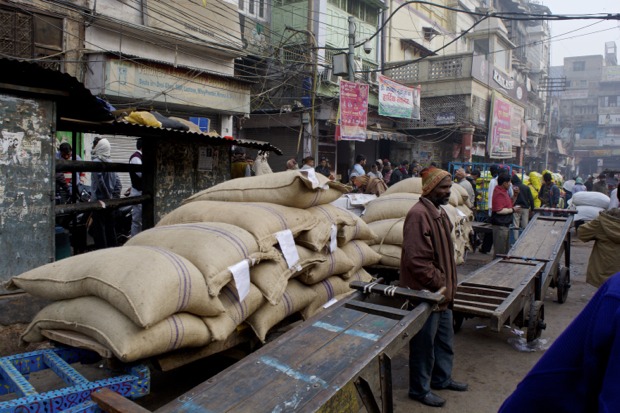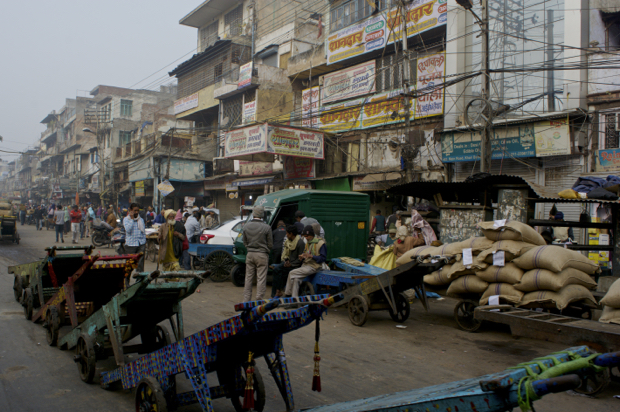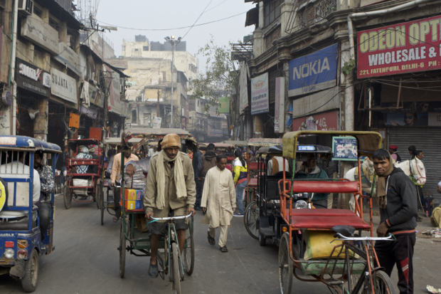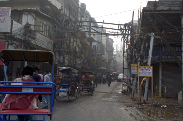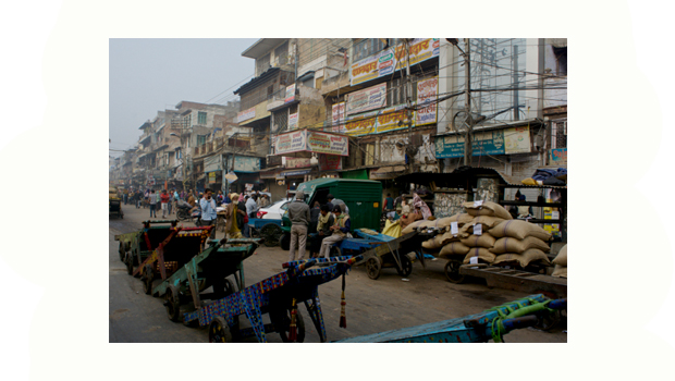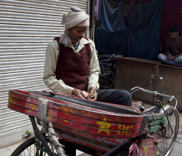 We are in a rickshaw cruising through the narrow streets of Old Delhi.