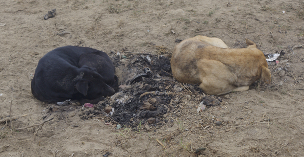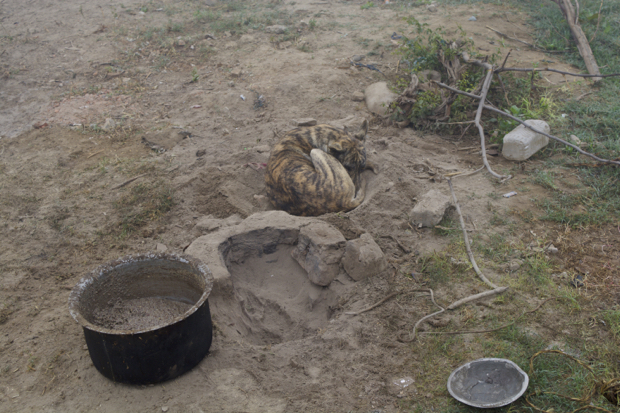 The dogs dig a hole next to the fire pit in which to sleep.