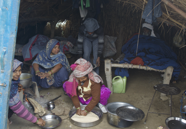 Family living in a dirt-floored shack – still sleeping, riding sheet a, and making bread.