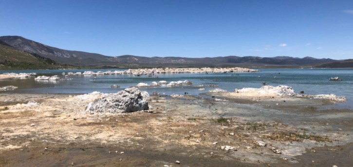 Mono Lake is a saline soda lake in Mono County, California, formed at least 760,000 years ago. The lack of an outlet causes high levels of salts to accumulate in the lake and make its water alkaline.