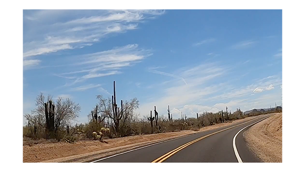 I was hoping for a road like this across Arizona. Smooth pavement slowly meandering through the saguaro cactus with blue skies and white clouds.