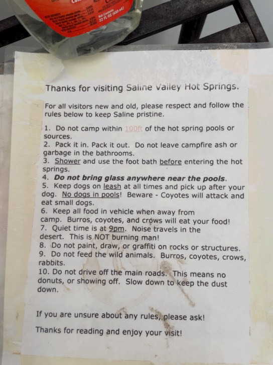 The Saline Valley Hot Springs have a sorted history of being an old-school, free-thinkers, nudist hang-out. And it was. Jimmy and I camped at the end of the camping area a good distance from the others. It was a mixed bag of desert creatures and unfortunately we fit right in. That night we did not try the hot springs because they were filled with a bunch of naked white fat guys. No Thank You.