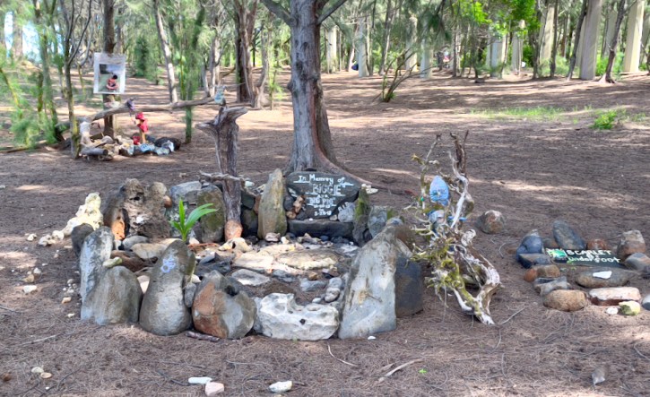 Baldwin beach is on the island of Maui near the city of Paia. It’s a drive-up beach with broad white sand surrounded by a forest of greens and palm trees. Underneath the trees were numerous memorials to friends who either died at this beach (the ocean can get furious along this coast for the wind surfers) or this was their favorite spot. It was quieting reading the attached stories, photos, and articles on each memorial. Most of these people were young and I hope went out doing what they loved best.