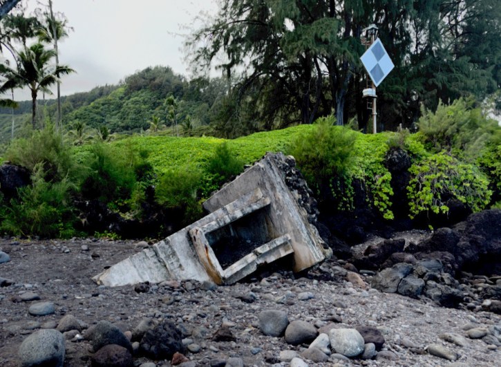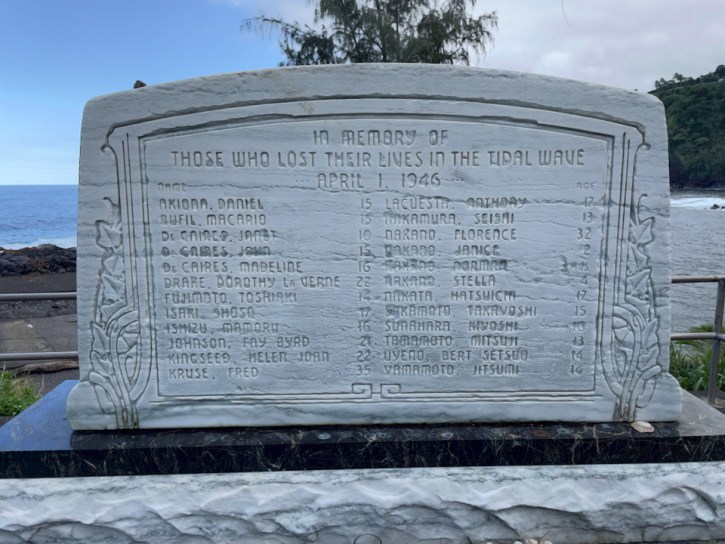 On April 1, 1946 the Big Island of Hawaii was struck by the so-called “April Fools Day tsunami”, originating from an Aleutian Islands earthquake. Approximately 160 people on the island were killed. While the greatest number of deaths occurred in Hilo, the school building at Laupāhoehoe was inundated, and twenty students and four teachers were drowned. A monument to the dead now stands on Laupāhoehoe Point. The town was moved up on to the hilltop so that they would never be hit by a tsunami again.