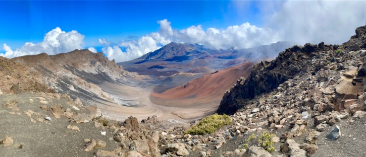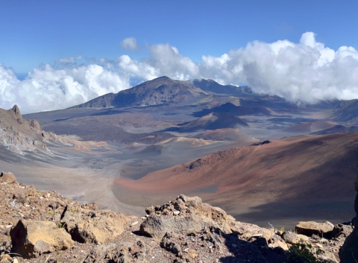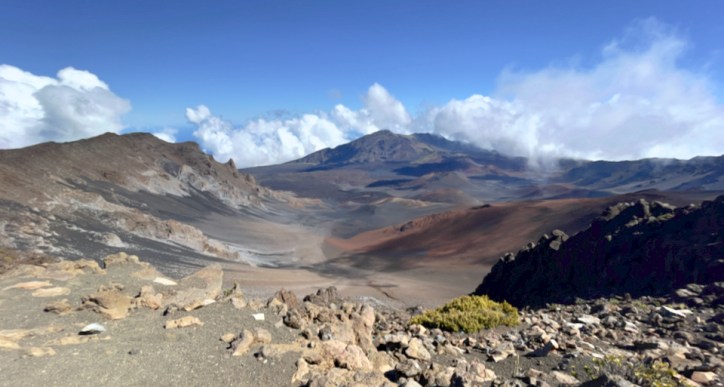 The tallest peak of Haleakalā (“house of the sun”), at 10,023 feet. From the summit one looks down into a massive depression some 7 miles across, and 2 miles wide, and nearly 2,600 feet deep. The surrounding walls are steep and the interior mostly barren-looking with a scattering of volcanic cones.
