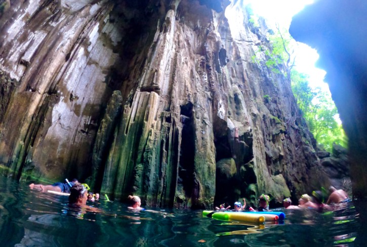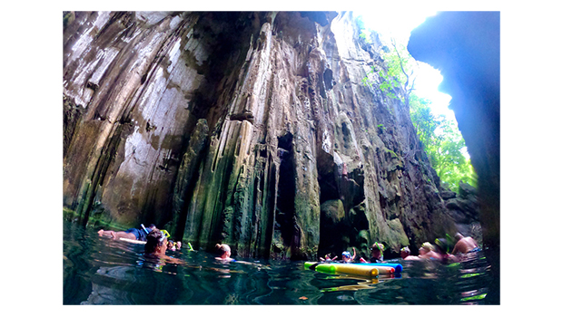 The ship anchored as the shore boats took everyone to the sea caves. Bring fins and your snarling gear. We landed on a small beach and up the stairs and into the grotto. Does the stairs and jump in. Water was warm and inviting. Inside the main chamber was an opening to a much smaller and totally dark inner chamber. The entrance to the inner chamber was tiny and under water. You needed to hold your breath and be guided into the inner chamber by crew with flashlights. Of course Janine had to be in first. I stayed out with the GoPro waiting for her return. Hear her description in the video.