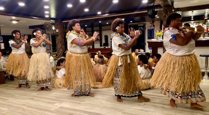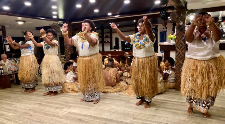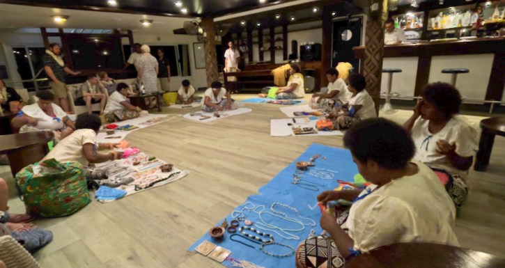 After dinner towards the end of the week onboard, the ship ferried almost an entire village out to us for a Fijian music and dance show. After the show, the village women spread out their craft stores on the floor and we bought up interesting fabrics and other traditional mementos.
