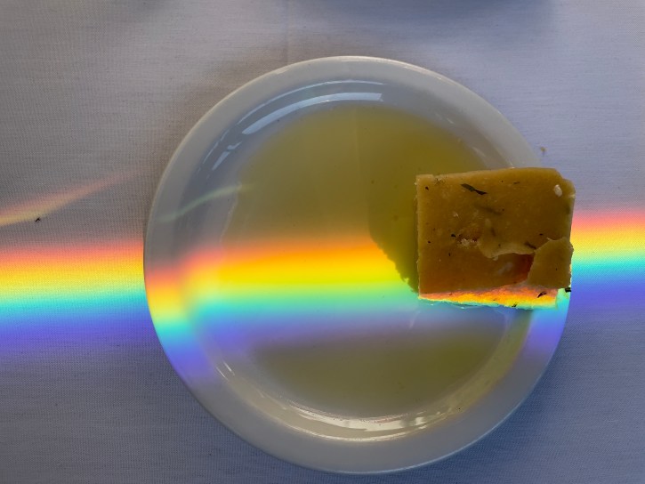 This is bead and olive oil being hit with a prism light beam from a restaurant window.