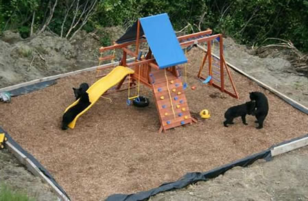 Some people build swimming pools in their back yards. But outdoor pools in Alaska just won’t work. Since this particular family lives on the outskirts of Anchorage, they decided to build a sturdy, colorful playground for their 3 and 4 year old sons, with smooth-stone gravel all around it to avoid knee scrapes and other injuries. They finished building it on Saturday evening, and the following morning, as the mom was about to wake up the boys and have them go out to play in their new play center, this is what she saw from the upstairs window: