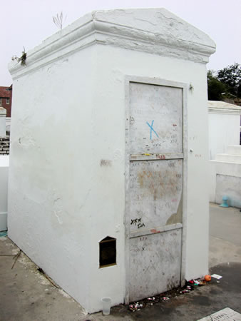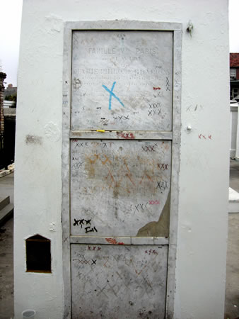 Here tomb is in an “interesting” area of New Orleans (was I PC enough?) After seeing her tomb, I hoped to have my wish granted of getting out of the graveyard alive (since people were being killed every night in this area). Instead of being a scofflaw and marking her tomb, I drew three Xs on my forehead, got a glazed look in my eye, and walked out with a sideways shuffle. None of the locals saw that as unusual and I lived to be a weirdo again somewhere else.