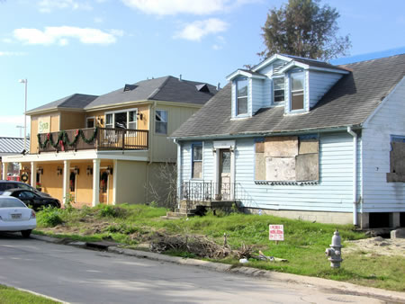 This view is all over the area. Completely rebuilt next to flooded and moldy shell.