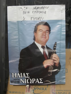 Most of the music in Greece is traditional ethnic music. Even the current pop music has ethnic roots and instruments. Traditional Greek dancing is the favored sport at many of the clubs that host regional musicians and bands. With the traditional flavor, the clarinet player is often the star of the show. Here are a few posters for these local rock stars that I saw in several cities.