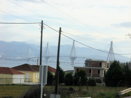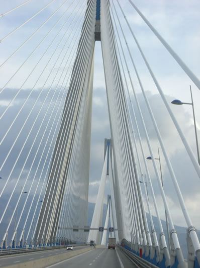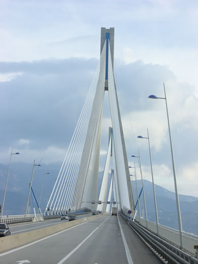 The impressive Rio-Antirio bridge is located to the north of the city of Patras and links Peloponnese to mainland Greece. It was completed in August 2004.