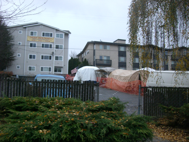 Seattle has a large homeless population. The city provides free bus service in certain parts of the city for the homeless among with many other services. One church has opened its parking lot to create a tent city. This is by the university – the home of the Huskies. The irony is the large banner advertising student housing hanging over tent city.