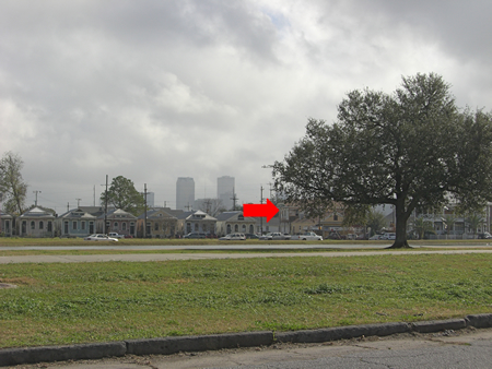 The row of houses along with the raised house taken on the other side of the bayou. The bayou is the second gray strip. Now you see why it flooded.