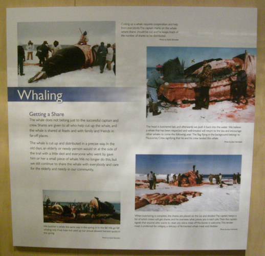 Barrow, AK is still a whaling city. Professional whaling is outlawed but subsistence whaling still is a way of life for Native Alaskans. Only Natives can hunt walrus, whale, polar bear, fox, and wolves in this region. The seal covered whaling boats are still used today. Hunters must sneak up on the whales and these ancient boats are silent in the water. Later in the season, powered boats are used to chase down the whales. Here are some photos from the Native Heritage Museum.