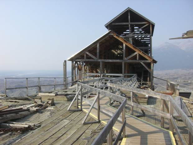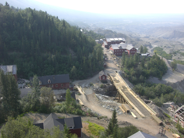 The Kennicott copper mine near McCarthy, AK was a very productive mine from 1910 to 1938. It produced over $200 million of copper and in today’s money would be a couple of billion. It primarily fed the voracious appetite for copper to build the electrical wiring network on the East coast. The mine is five miles up in the mountains and transported the copper ore to the processing facility via overhead tram. These red buildings are the processing and sorting facility where they smashed and separated the copper from other rocks, bagged it and sent it via train to Cordova, AK and then to a smelter in Tacoma, WA via ship. The facility is fourteen stories high and utilized gravity to assist in the sorting process.