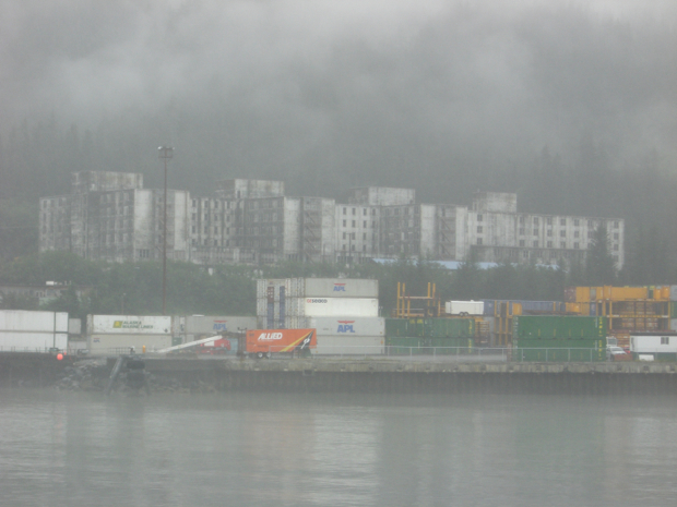 My son Chris and I went on an Alaskan adventure vacation to have the glacier experience. We were going to take the ferry from Whittier, AK to Valdez. Our first stop was Whittier. This city was created by the Army during WWII as an ice-free port that was kept secret from the Japanese. A two-mile tunnel had to be constructed through the mountains to access this small sliver of land. It initially had a railroad spur whereby the Army could unload supplies for the war effort in Alaska. It is a creepy little isolated town with a reputation for housing residents who want to be left alone – if you get my drift. I can hear the banjos playing off in the distance. Much of the city is an abandoned Army depot with a huge government building that can’t be demolished because it has asbestos and would all have to be trucked out through the tunnel at an amazing cost. So it stands calling to tourists and thrill seekers who want the scariest experience of their life if they have the courage to enter the facility at night.