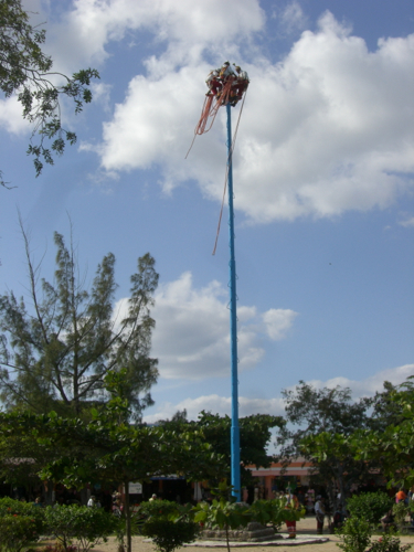 Mayan ancestors have built a 50 foot pole where every 20 minutes they demonstrate Mayan pole dancing. A dance is done by they climbers, they climb the pole, wind the rope around the pole, and then fly upside down as the rope slowly unwinds.