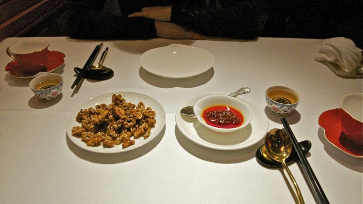 Gold plated utensils along with brazed nuts with chili sauce.