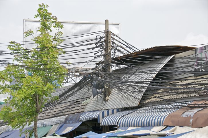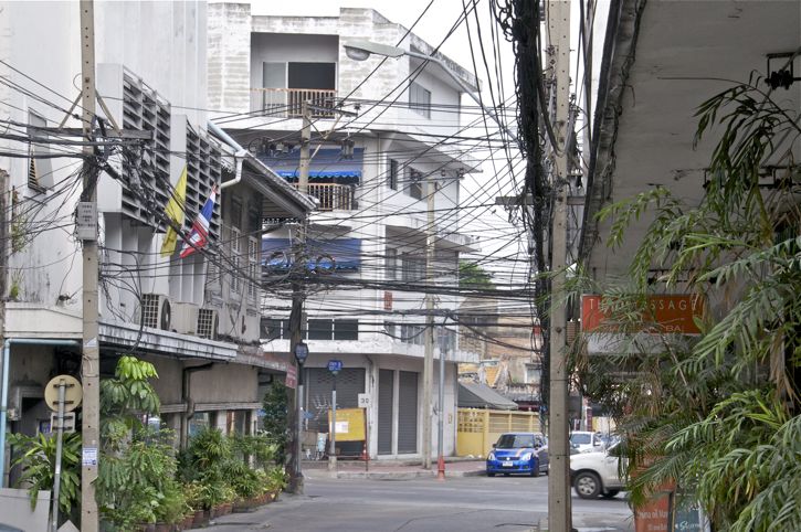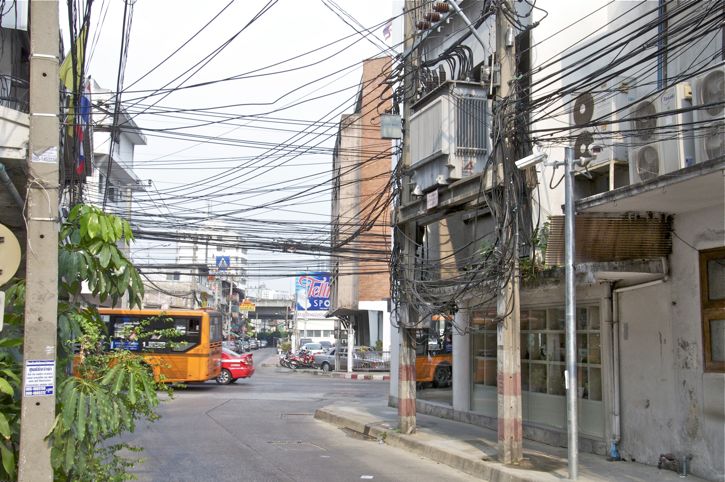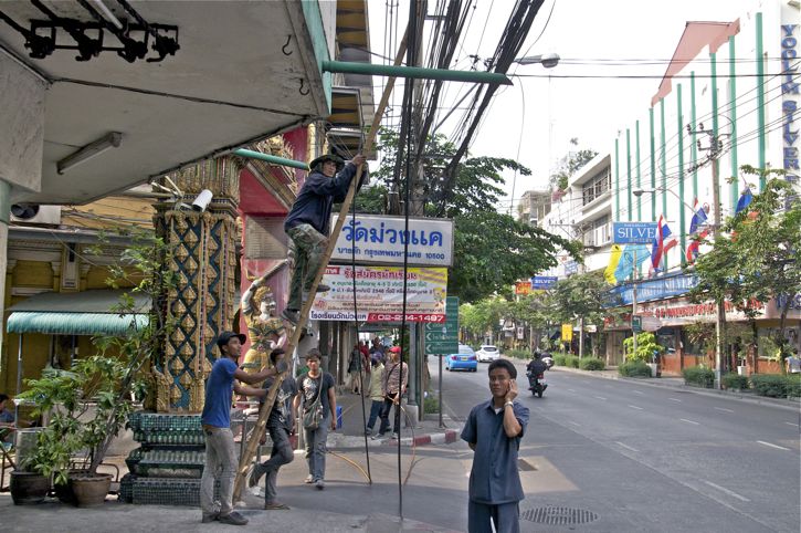 Apparently there are no rules for public utilities such as electrical and communication lines. If you need one, you get a crew and string one up. Just in the few days we were in Bangkok, we saw crews stringing lines by hand – no trucks or equipment required. Check out some of this action.