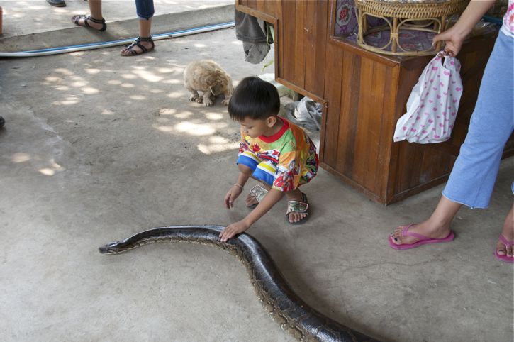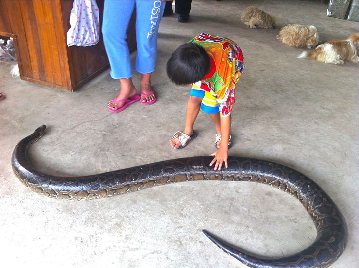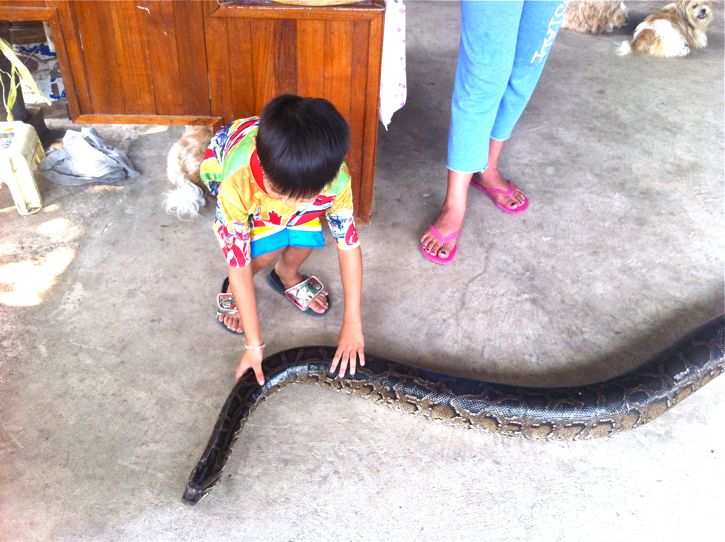 This is the youngest boy playing with the monster. Notice the small dogs in the background. I was told that the snake and the dogs were friends. Oh by the way, they keep the snake fed each week with a chicken. I guess that’s what brings on the friendship.