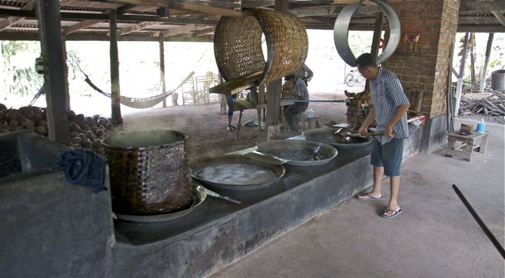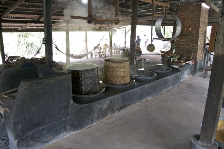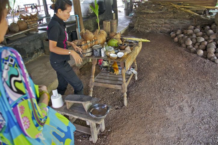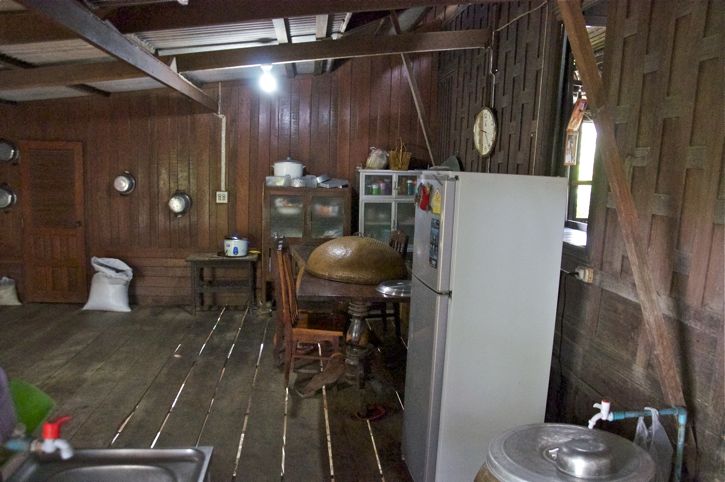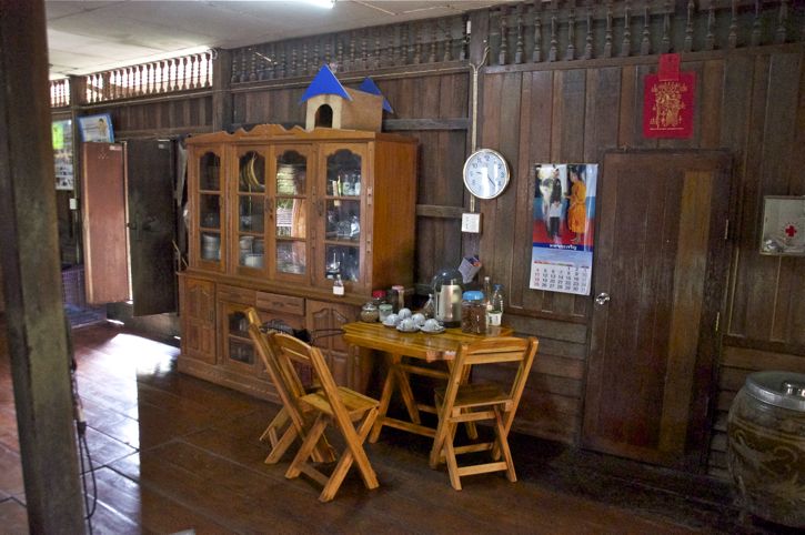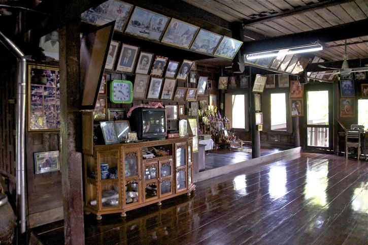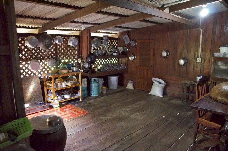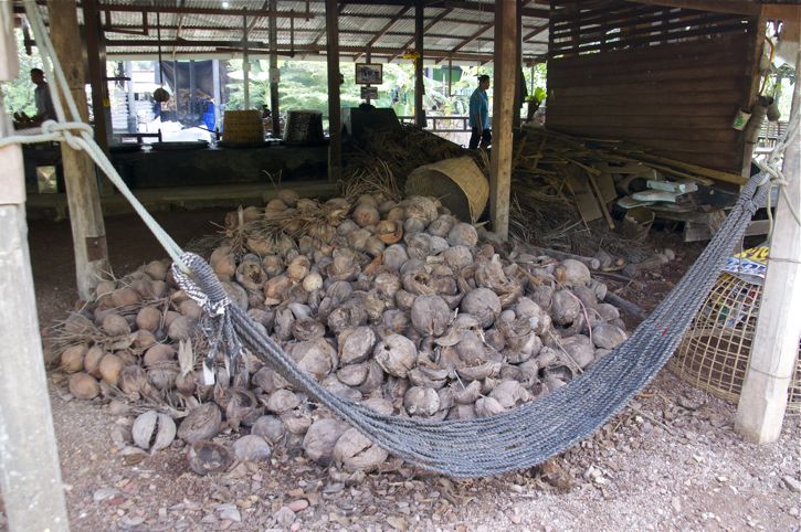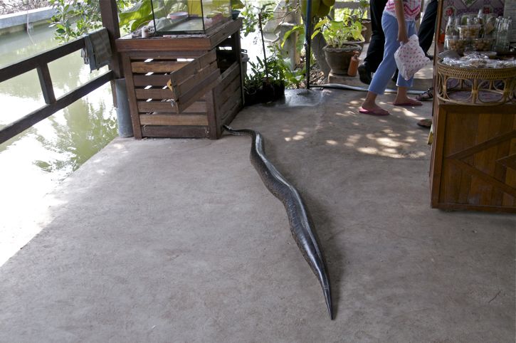 On our way to the floating market outside Bangkok, we stopped by a local family that made coconut syrup. Their house was connected to their work area so we got a tour of a traditional Thai house. The house is spartan but with all the amenities of an American home. The only difference was this house had a 65 pound python that you could wear for a few Bahts. I had to face my fears and put on the snake. It was very disconcerting. As Janine took her sweet time taking my picture, I visited the place called “High Anxiety.” Even though the snake was harmless to adults, it’s constant movement around my neck and body was intriguing.