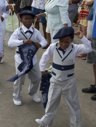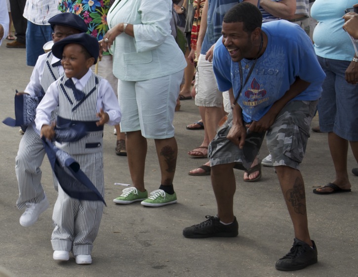 The second line is a tradition in New Orleans. Youngsters are trained from an early age to take up the tradition. At Jazz Fest there is always a second line going on some where. Here are a couple of young men in training being coached by their dad.