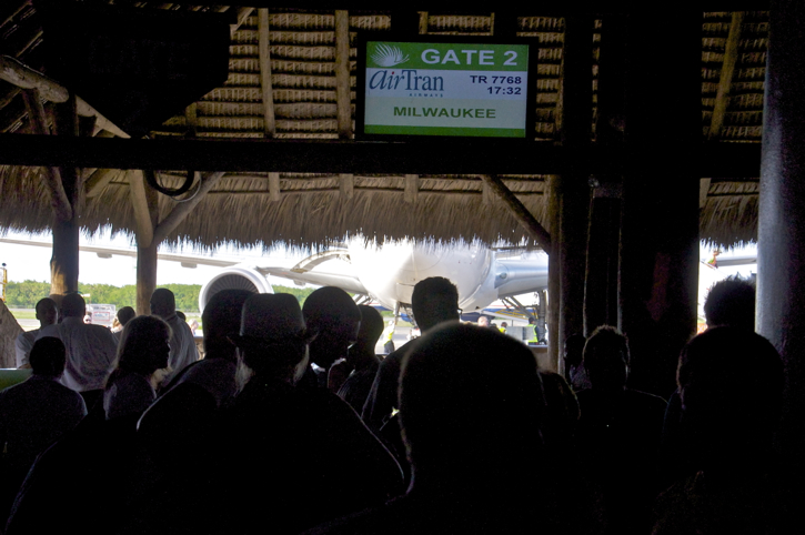 Flying in and out of Punta Cana, Dominican Republic is a different experience than flying around the US. The airport is cut out of the jungle and the terminal is a huge grass covered hut next to the runway. When we were leaving on a Sunday, there were probably twenty planes parked all over the taxiways. There are no spouts to load the plane. When your flight is called you just walk out to the plane and go up the stairs. We flew out on LAN Chilean Airlines on our way to Miami in a brand new 767. Quite a different experience than slugging along in a 20 year old USAir 737 from Newark to St. Thomas. Sunday is not the day to travel off the island. Thousands of people were all going home – mostly to Europe, Russia, and South American countries. The sign below just happened to be the only other flight that afternoon going to the US.