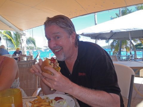 As I have stated in previous posts, I never try to eat anything larger than my head. Well, there are times you have to go against your best intentions and go for it. We were at the restaurant after a boat ride out towards St. Croix to deposit Janine’s dad’s ashes into the sea at his favorite dive spot. The seas were quite rough and even though I was heavily medicated, it was a difficult trip for me. When we returned to the St. Thomas Yacht Club I needed major food and spotted this burger on the menu. It had extra large patty with multiple cheese slices, bacon, onion, pickle, tomato, lettuce, thick bun, and a fried egg inside along with a side of fries. I went for it. It took several other people at the table to help me finish it off.